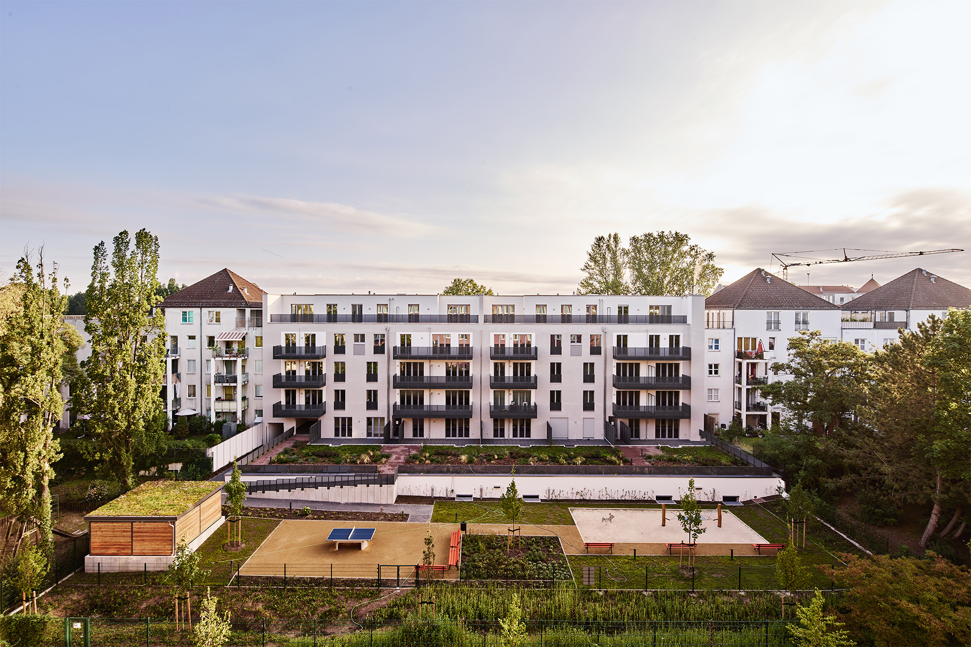 Die Freianlagen befinden sich vornehmlich auf der Gebäuderückseite und orientieren sich, geschützt zur Straße, nach Süden. Durch die L-förmigen Gebäudegrundriss entsteht so ein Innenhof mit Terrassen, Spiel- und Aufenthaltsflächen. Der nördliche Teil der Freiflächen im Hof liegt auf der Tiefgaragendecke mit privaten Terrassen für die EG-Wohnungen.